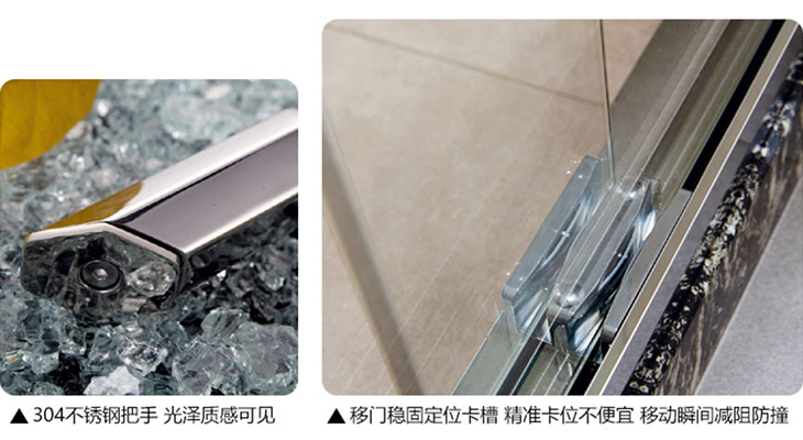 安全+静音:精磨10K镜面,明亮不沾污,304不锈钢框架,超强承载力,加上双导轨静音滑轮设计,推拉顺畅自由,加上隐形防爆安全膜,安全、静音,卫浴空间干湿分离,现代淋浴享受触手可及。
