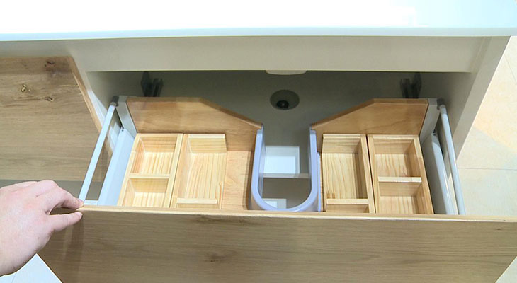 美迪奇NATA浴室柜定位于小孩在12岁以下的家庭,极简主义几个外形设计,搭配现代流行的混搭原木柜体,一高一低的龙台设计让亲情从不遗忘家庭任何角落,时尚又充满温情。