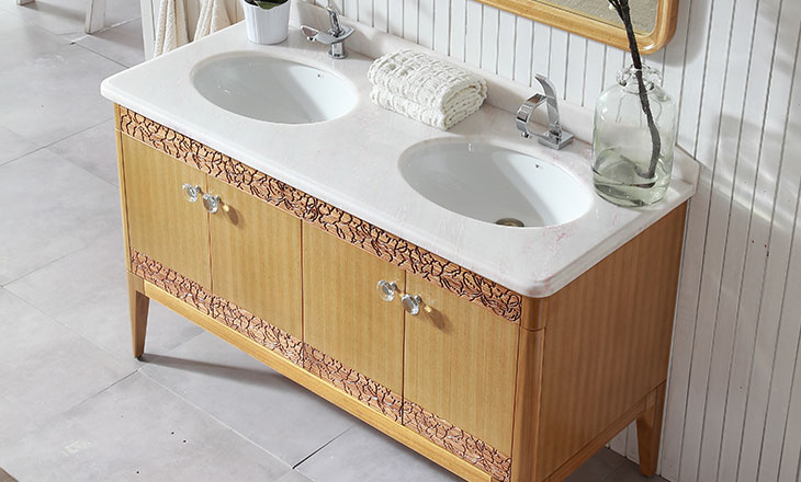 这款素色东方浴室柜以天然大理石为台面,采用双盆设计,有效降低等待时间,纹理清晰,坚实易清理,配以唐彩专用单孔龙头,与浴室柜整体的搭配相得益彰,高端大气且风格多样。