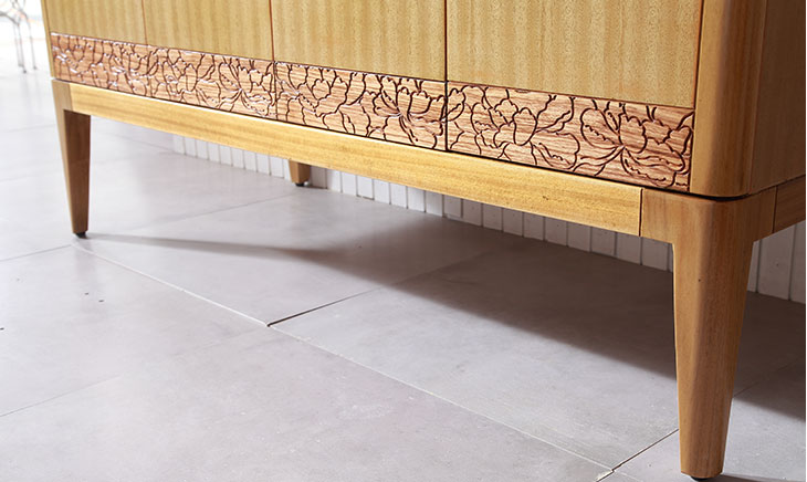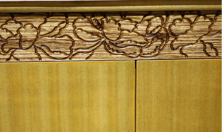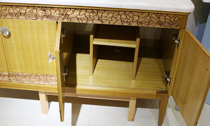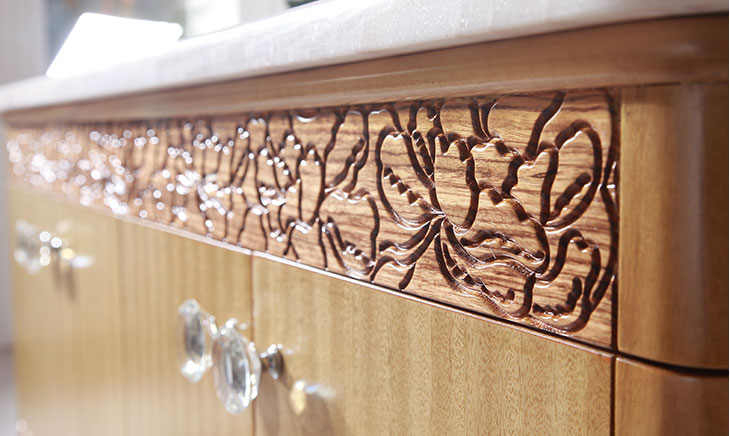 浴室柜采用纹路雕花,在金丝柚上完美镶嵌乌金木,雕刻以牡丹花造型,独具东方韵味与美感。